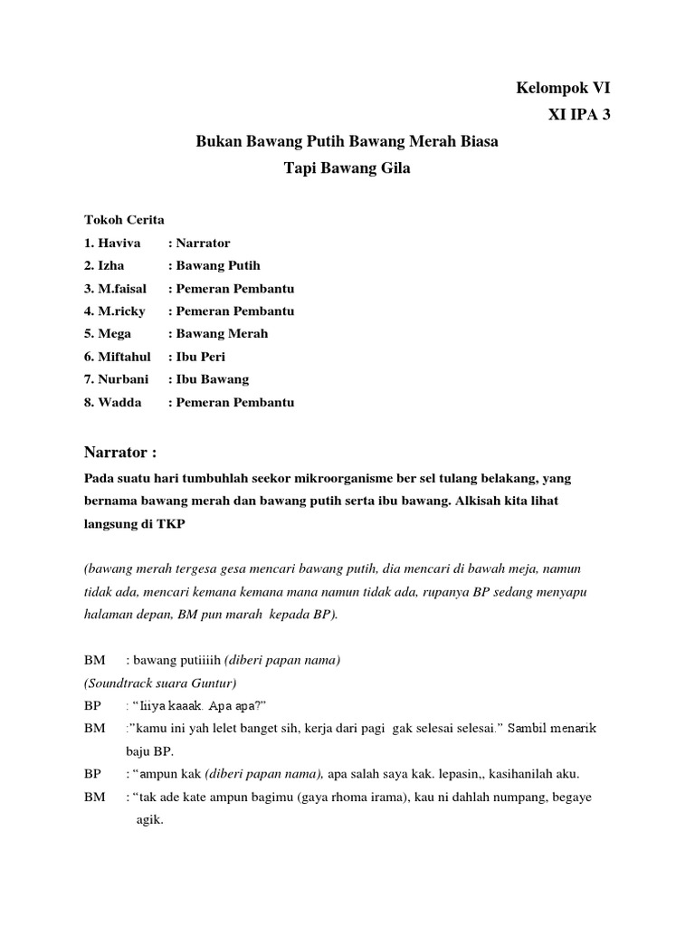 Bawang merah, bawang putih, ibu tiri, ayah bawang putih. Ing satunggaling dusun wonten kaluarga bahagia yaiku kaluarganipun bawang putih. Naskah drama bawang merah bawang putih versi sunda. Contoh naskah drama bawang merah bawang putih 6,7 orang dalam bahasa inggris narator: Bawang merah and bawang putih.